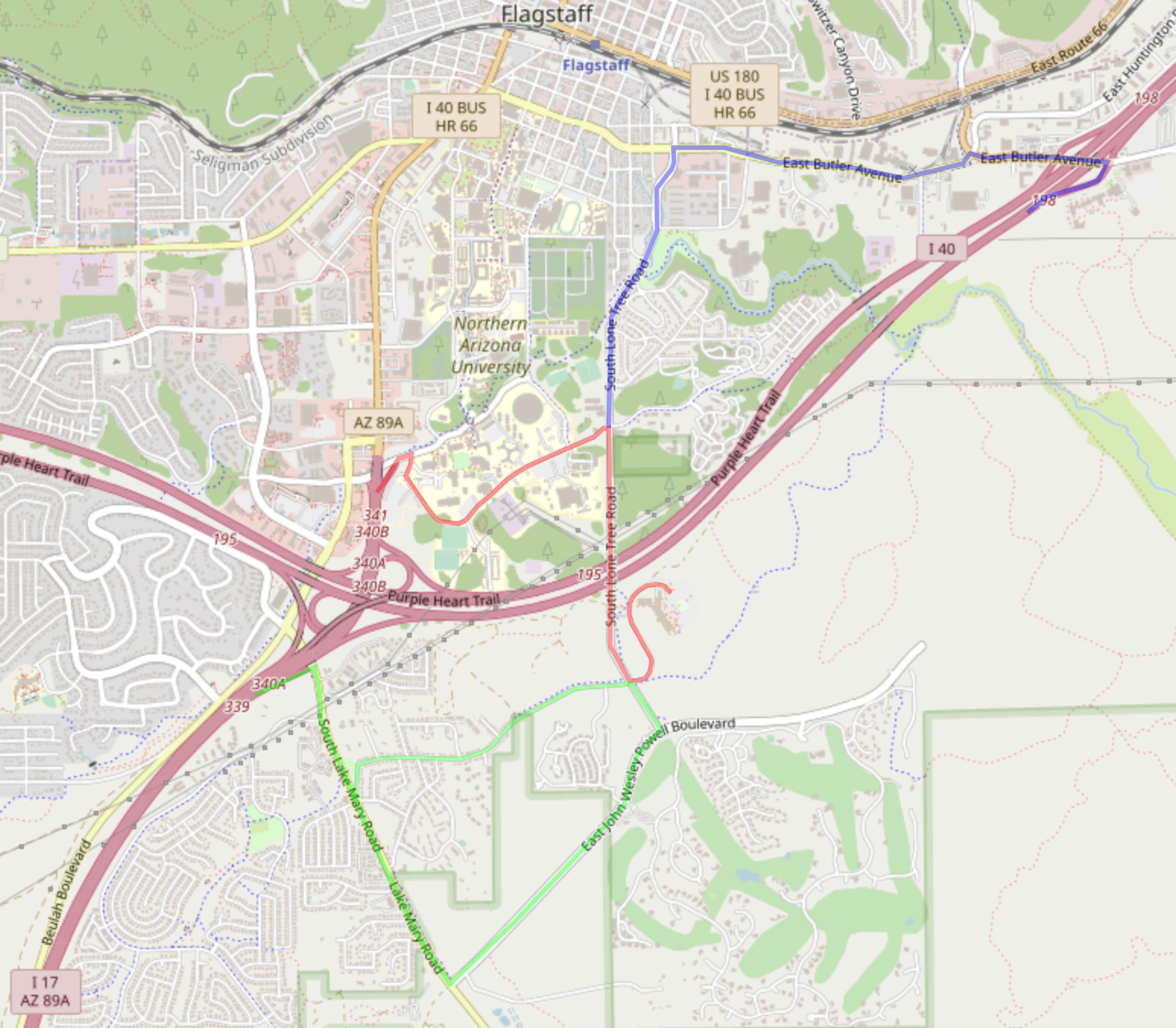 From the intersection of Pine Knoll Drive and Lone Tree Road, travel south on Lone Tree Road 0.8 miles to Connell Drive. (Note: Connell Drive in Google Maps is called East Zuni Drive in Open Street Map.)